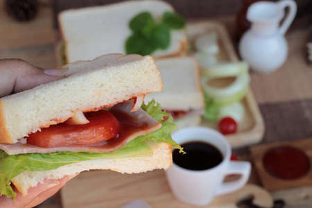 Top view of Healthy Sandwich toast with lettuce, ham, cheese, tomato and coffee, on a wooden background