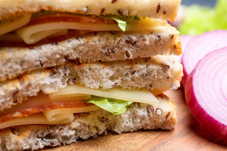 sandwich with cheese, tomato, onion and lettuce on wooden background