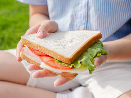 Lunch in the park. The girl holds a juicy sandwich in her hands. Close-up