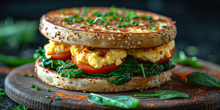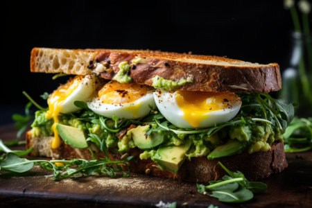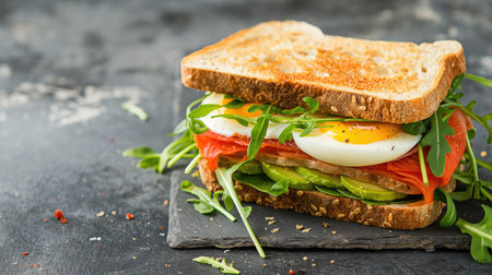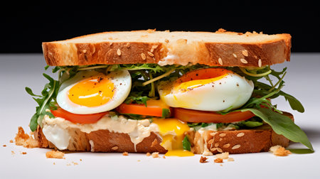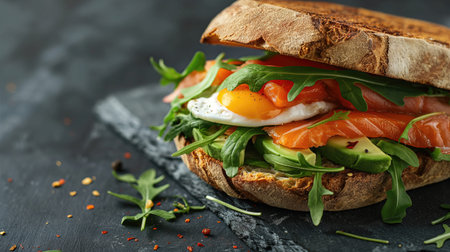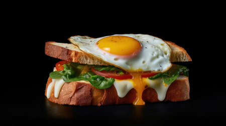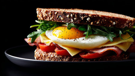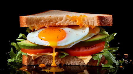 Delicious sandwich with fresh greens, tomatoes, and a runny egg yolk Closeup shot to capture the details of its layers against a dark background
