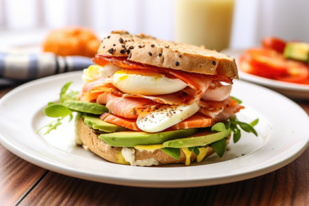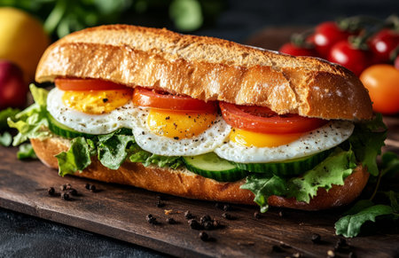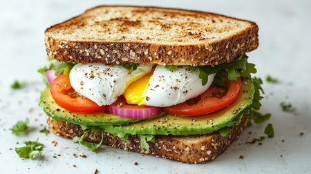 A mouthwatering sandwich features layers of ripe tomatoes, creamy avocado, crisp lettuce, and perfectly poached eggs nestled between slices of toasted whole grain bread, ideal for brunch.