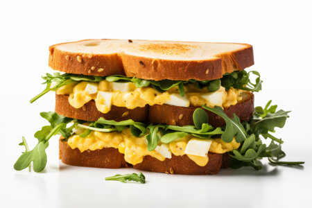 A classic egg salad sandwich captured in a close-up realistic photo against a white background Generative AI
