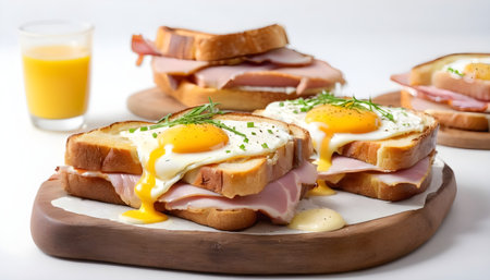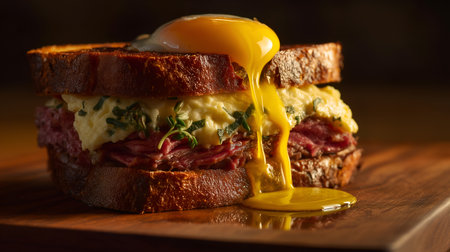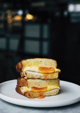 Delicious Breakfast Sandwich with Ham, Egg, and Cheese with Oozing Egg Yolk on Toast in Kitchen Setting AI Generative