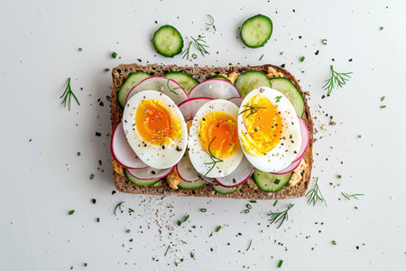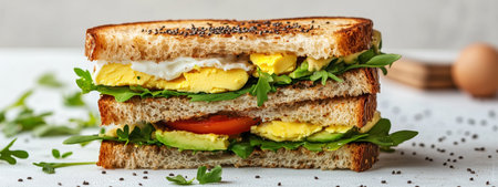 A delicious sandwich layered with eggs, greens, and tomatoes on whole grain bread garnished with seeds on a clean backdrop