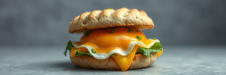 Mouthwatering sandwich with melted cheese, fresh greens, and a soft bun served on a gray background