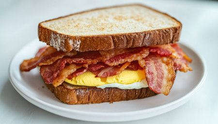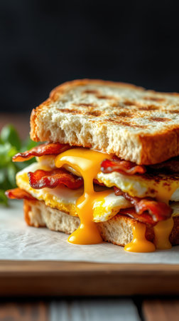 Mouthwatering breakfast sandwich with crispy bacon and gooey cheese on toasted bread