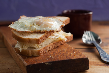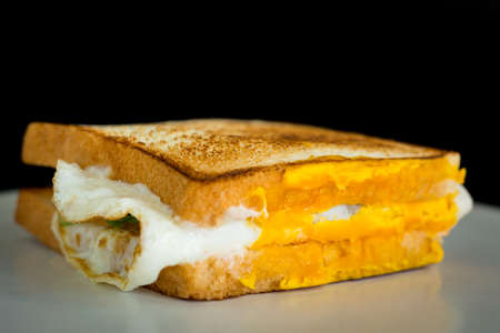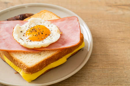 Top view - Grill sliced bread with fried egg and ham cheese.
