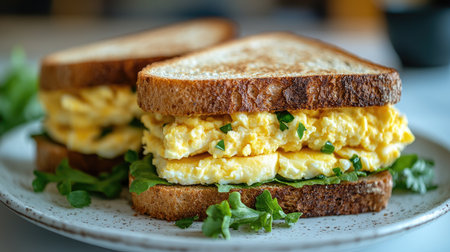 Scrambled eggs sandwich with toasted bread and fresh greens, perfect for a healthy and protein-rich breakfast