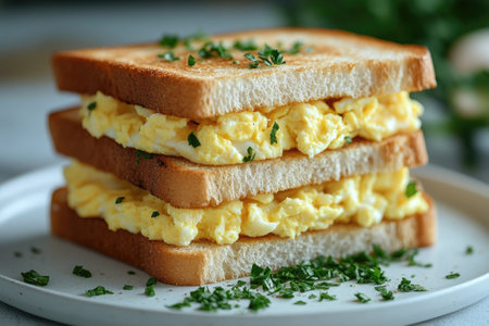 Savory egg sandwich featuring fluffy scrambled eggs between slices of toasted white bread, garnished with fresh parsley
