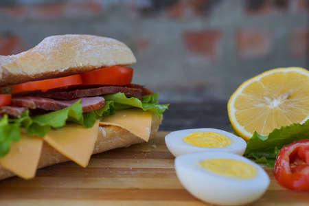 big tasty sandwich with tomato lettuce with soap and ham on the board