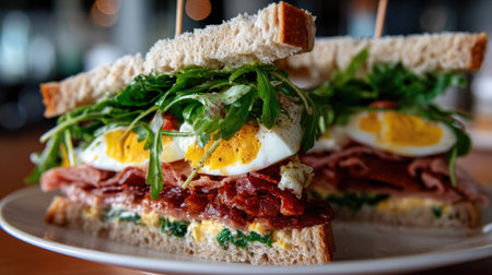 A mouthwatering sandwich showcasing vibrant layers of roast beef, crispy bacon, fresh greens, and a perfectly cooked egg on whole grain bread, ideal for any meal.