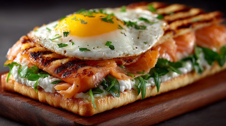 A grilled sandwich features layers of smoked salmon and cream cheese, topped with a perfectly fried egg. Fresh herbs add vibrant flavor, served on a wooden board.