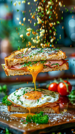 Yolk flow and herb scatter evoke clarity, ritual, and editorial depth in culinary storytelling. Bread texture and meat layering highlight richness, warmth, and flavor rhythm.