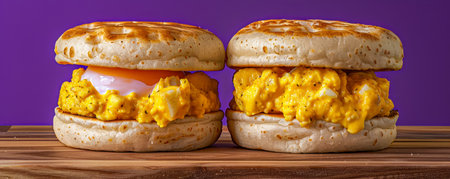 Delicious Scrambled Egg Sandwiches on English Muffins Against Purple Background AI Generative