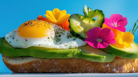 Morning light shining on freshly prepared avocado toast with egg and vibrant veggie toppings