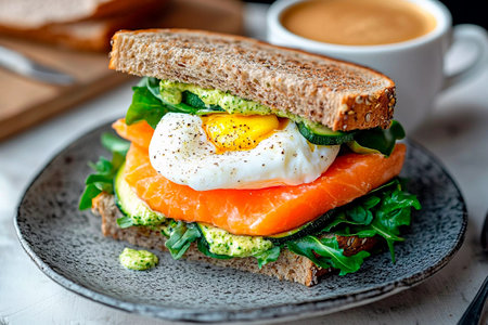 A flavorful sandwich featuring layers of smoked salmon, a perfectly poached egg, and crisp greens, all on hearty whole-grain bread, accompanied by a warm drink.