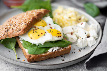 sandwich with quail eggs, curd cheese and spinach on a gray plate