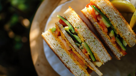 A vibrant and colorful vegetable sandwich stacked high on a plate. Fresh ingredients like lettuce, cucumber, and tomato create an appetizing display, perfect for healthy meals.