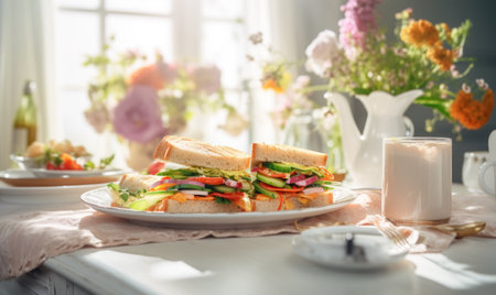 Breakfast with sandwiches, coffee and flowers on table in bright room