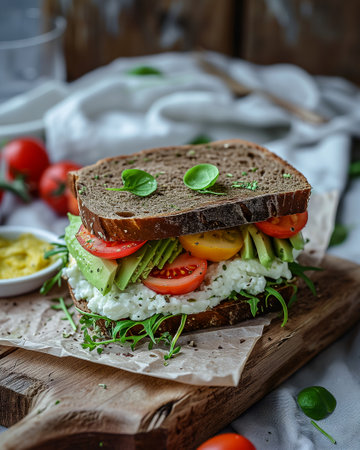 Sandwich with black rye bread, cottage cheese and avocado mousse