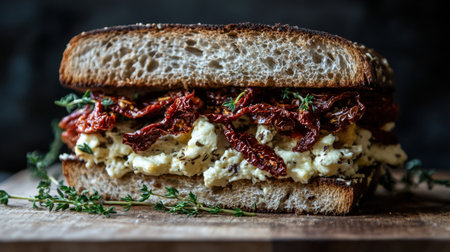 Close-up of a gourmet goat cheese and sun-dried tomato sandwich, garnished with thyme, served on a wooden board.