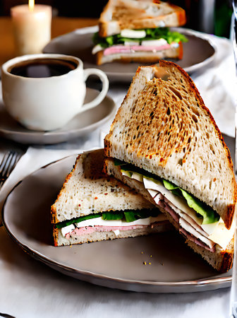 Realistic sandwich neutral colors warm lighting detailed cozy atmosphere no people in a restaurant setting. Generative AI Generated