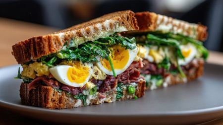 A mouthwatering sandwich featuring layers of fresh spinach, sliced eggs, and savory meat, served on toasted bread, perfect for any meal.
