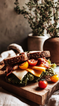 A beautifully crafted breakfast mega sandwich showcases layers of lettuce, crispy bacon, and vibrant tomatoes on hearty bread, placed on a wooden serving board in a cozy setting