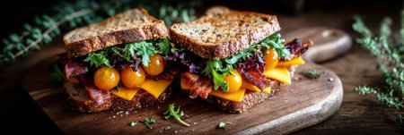 A hearty breakfast sandwich features crispy bacon, cheddar cheese, and fresh greens between two thick slices of whole grain bread, all presented on a rustic wooden board, banner