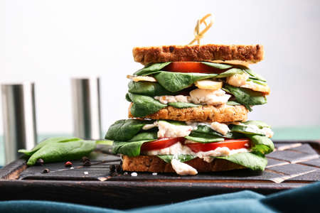 Delicious homemade sandwich with fresh ingredients on a wooden plate setting