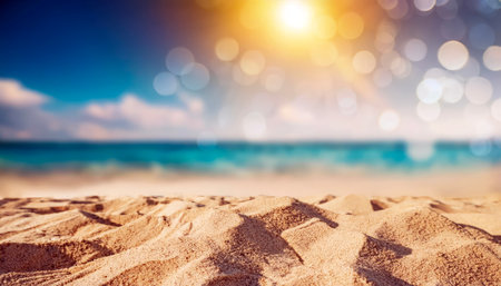 Sand with blurred Palm and tropical beach bokeh background Summer vacation and travel concept Copy space.. Generative AI