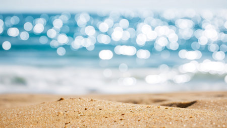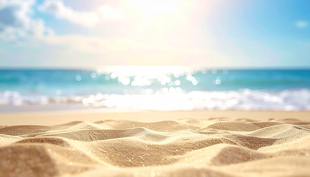 Fine grains of golden sand are scattered across a peaceful beach. The bright sun shines overhead, casting a warm glow, while soft waves roll in the distance.