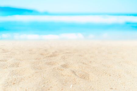 Closeup of sand beach with blue sky background. Summer vacation concept.