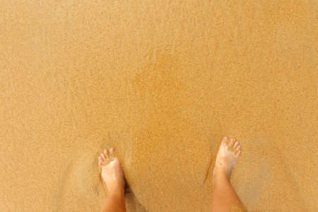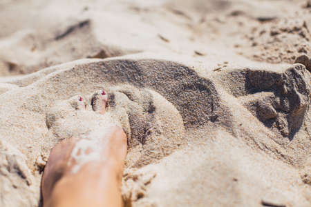 Woman tanned legs on sand beach. Travel concept.