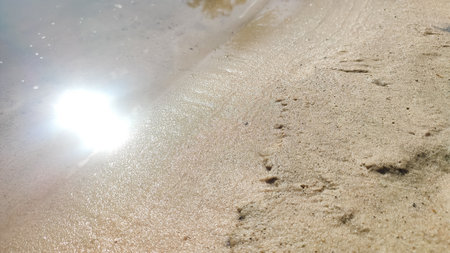 Soft wave of turquoise ocean washing golden sand on a tropical beach creating a relaxing summer seascape, perfect for a holiday travel background