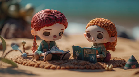 A couple of toy people standing on a beach, AI