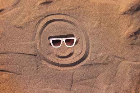 Sun in sunglasses drawn on Sand on Beach Holiday Background