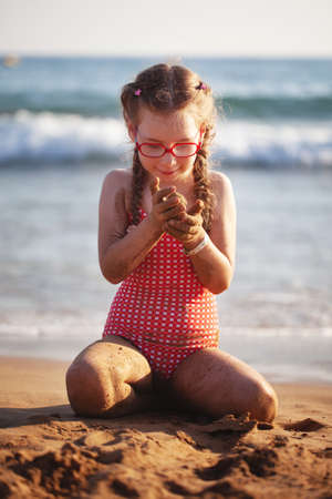 young girl in glasses plays on the sand beach