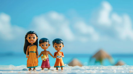 Cartoon Indian family on the background of the sea with copyspace. High quality photo