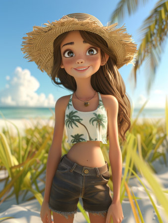 A young woman wearing a straw hat stands on a sunny beach