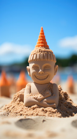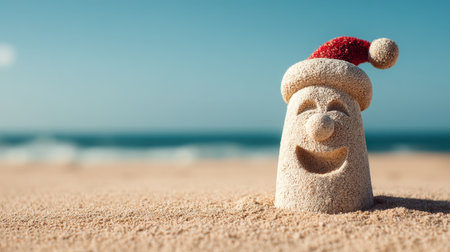 A cheerful sand sculpture wearing a Santa hat stands on a beach, exuding fun and holiday spirit under a bright blue sky, inviting feelings of joy and relaxation.