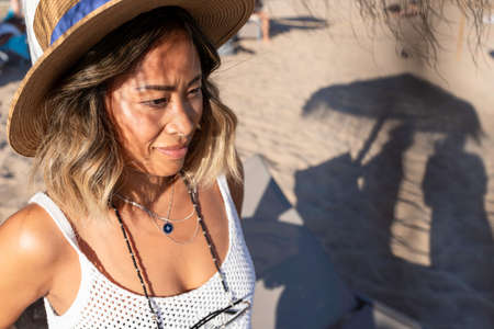 Beautiful asian girl on the beach playing with the sand and holding a summer sombrero hat at sunset facing the Atlantic ocean in Lisbon, Portugal. Object detail. Woman lifestyle concept of freedom.