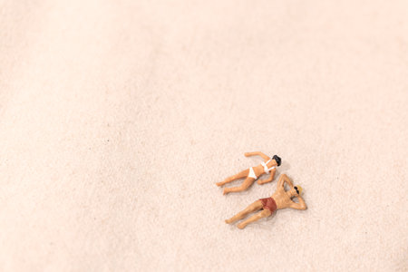 Miniature people , Couple sunbathing together on deck chairs on The beach
