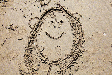 The happy face of a girl drawn on the beach