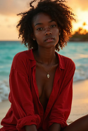 Beautiful young African American woman in red shirt on the beach at sunset