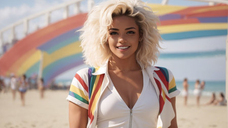 An AI generated illustration of a stunning blond-haired lgbtqia plus woman enjoying the sun and sand at a beach