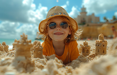 joyful boy in shades and a hat constructs sandcastles, epitomizing summer vacation bliss