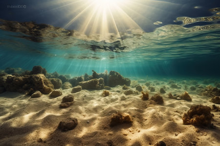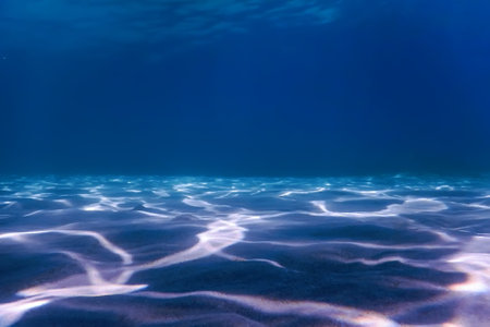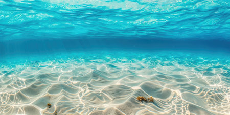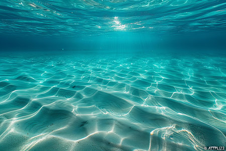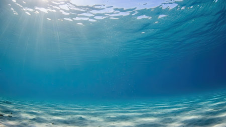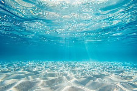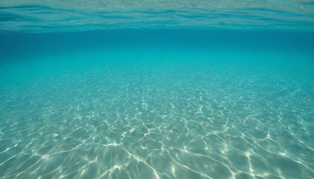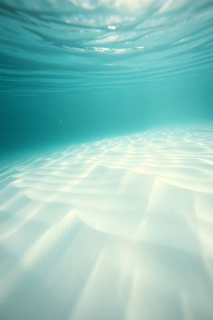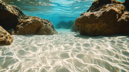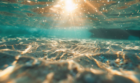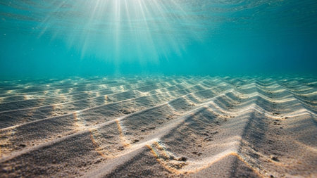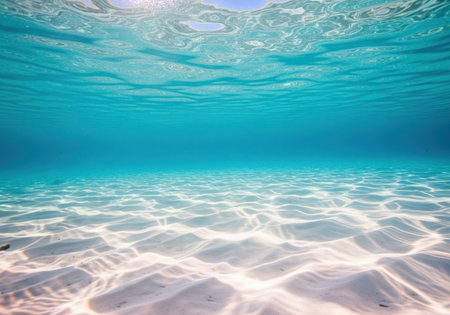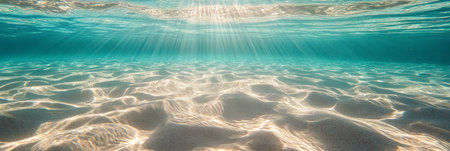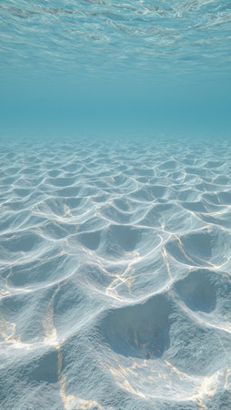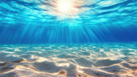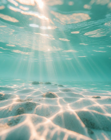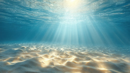 Experience a breathtaking underwater scene where sunlight filters through water, illuminating soft sand patterns on the ocean floor with a serene ambiance.