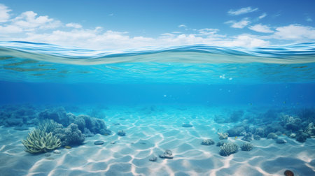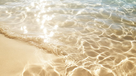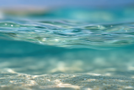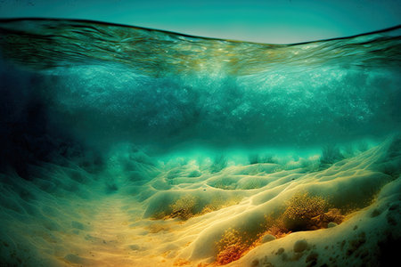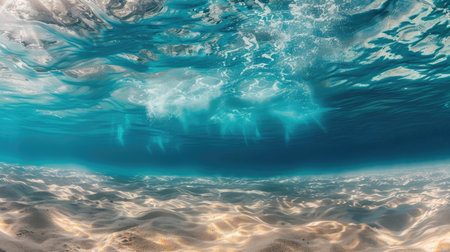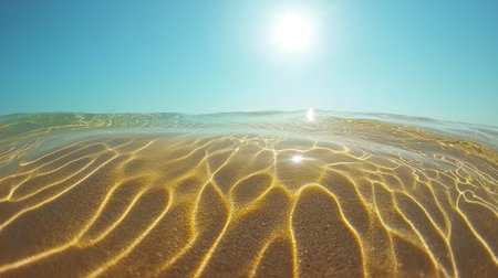 Experience the tranquility of a serene underwater view showcasing shimmering sand illuminated by sunlight, with gentle waves creating a peaceful ambiance.