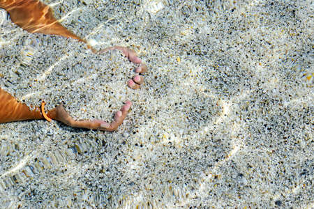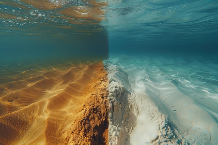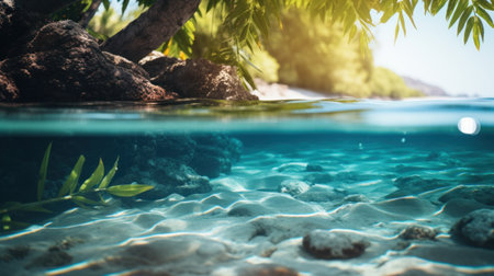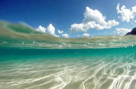 Partially submerged view showcasing crystal-clear water, revealing the sandy seabed below